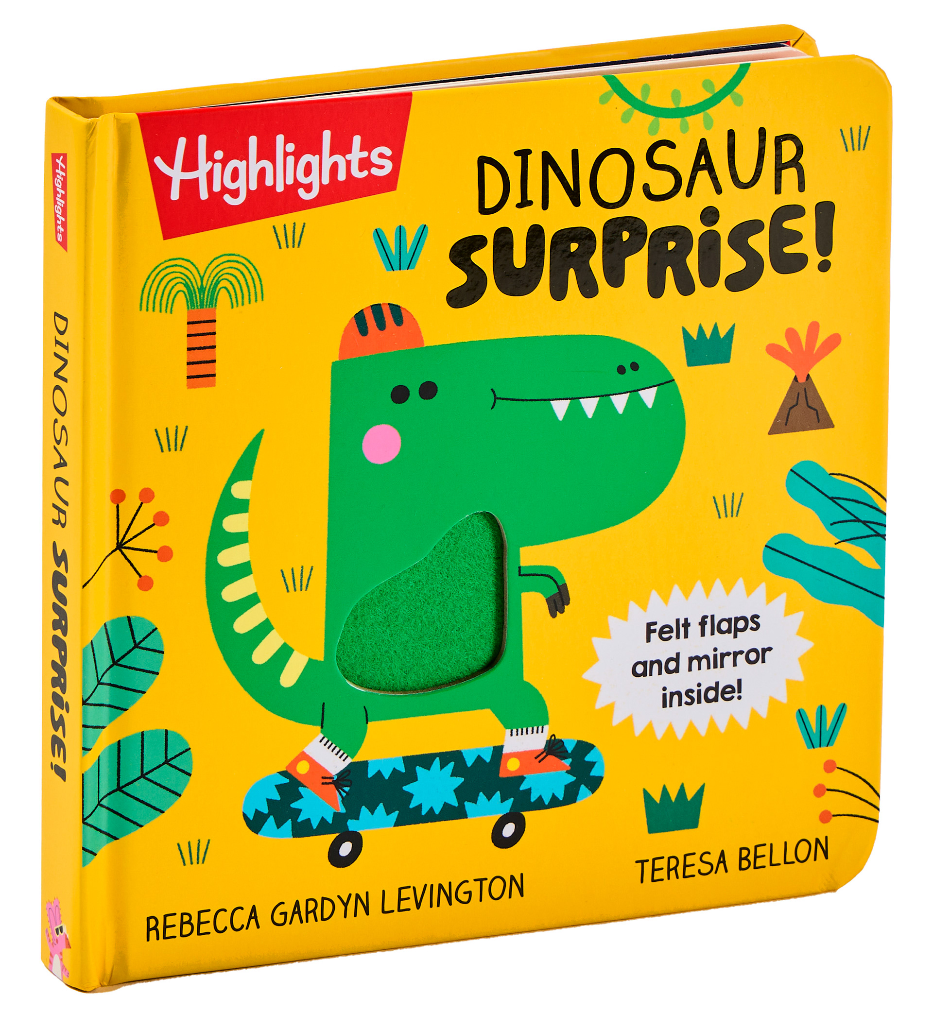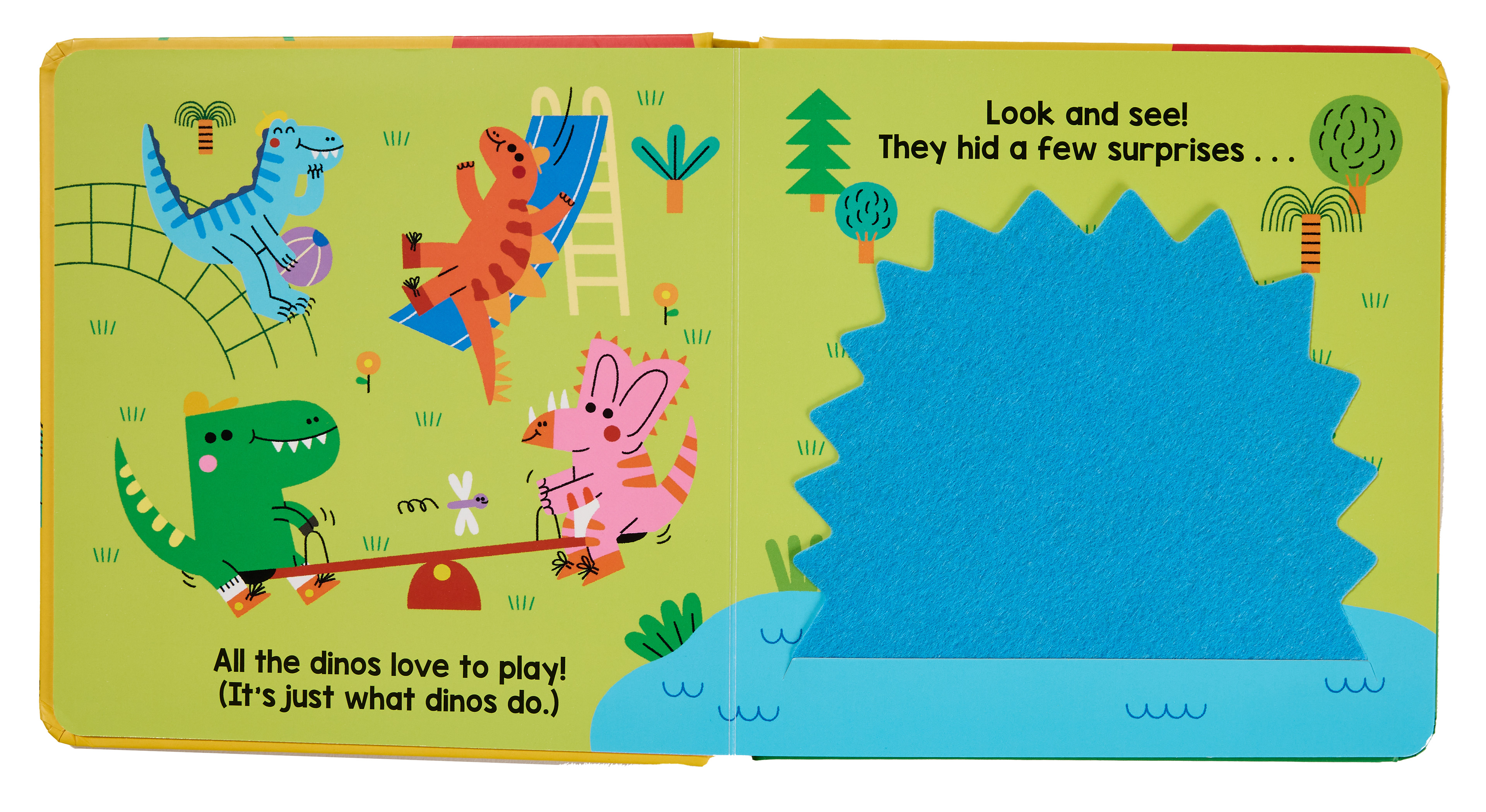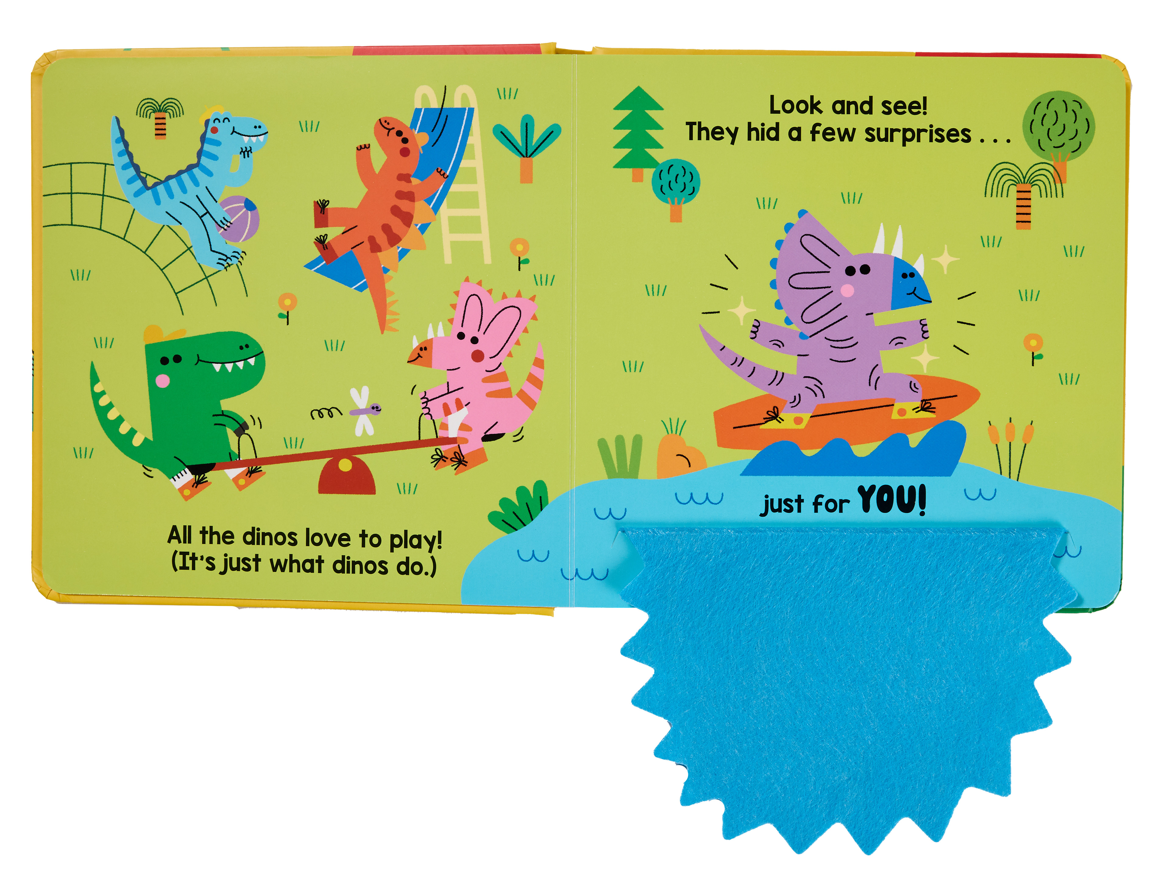 Dinosaur Surprise is the first title in Highlight's new "Surprise" series in the company's new venture in baby board books. Aiming to give a more tactile experience to babies, the title features die cuts and felt flaps for babies to tug, touch, and fold. The art style was kept simple yet playful.